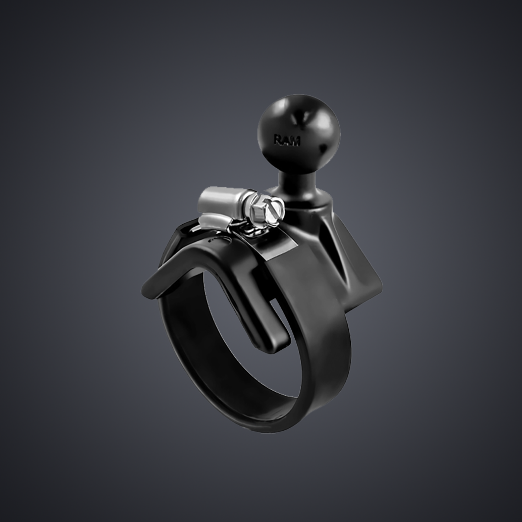 De stangklem RAM-B-108BU is eenvoudig te plaatsen op het stuur of andere buis van je motor of auto. Je plaatst de zadelvormige plaat op de rail en wikkelt de metalen klemriem rond de rail en de plaat. Je draait met een schroevendraaier de schroefkop op de metalen band, totdat deze stevig vast zit, De set bevat twee verschillende maten spanband. Een rubberen beschermstrip voorkomt krassen of markeringen op de ondergrond. De stangklem is compatible met vele RAM Mount armen.
